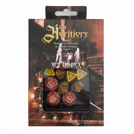 Ce set comprend trois D12, trois D10 et trois D8 spécialement conçus pour Les Héritiers, par Q Workshop. Leur design Belle Epoque épouse l’atmosphère du jeu. Les D10 et D12 comportent des faces à résultat négatif, comme le prévoit le système 3D.