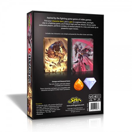 This starter set contains two characters: Troq the Well-Meaning Beast and River the Dancing Fencer. It also includes two sets of Orange and Diamond gem cards to augment your fighters.
